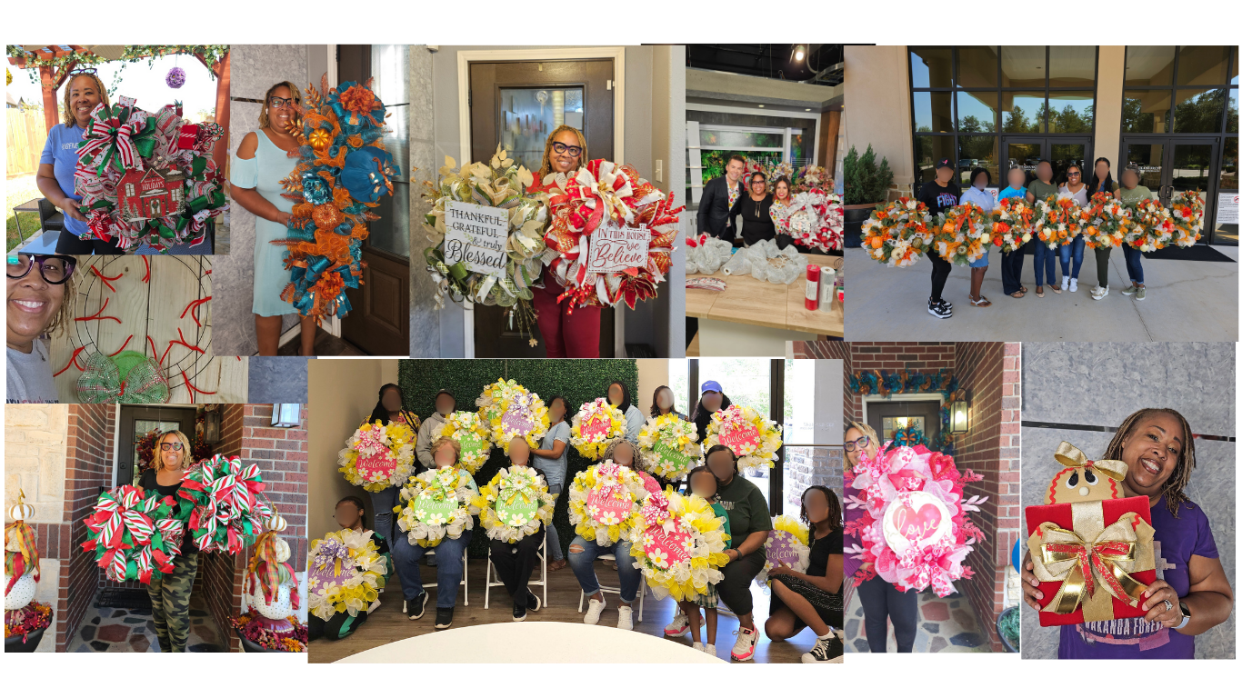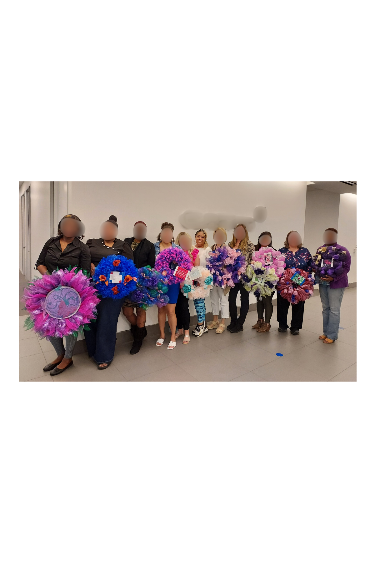 In 2022, life handed me an unexpected turning point. The company I worked for announced a divestiture, and my team of 18 employees — people who had become family — were moving to another organization. It broke my heart to think I’d lose them, so I did what came naturally: I created something meaningful from the heart. I designed a personalized wreath for each woman — capturing her favorite colors, florals, and personality. Some were sassy, others sweet or sophisticated, but every piece told her story. -