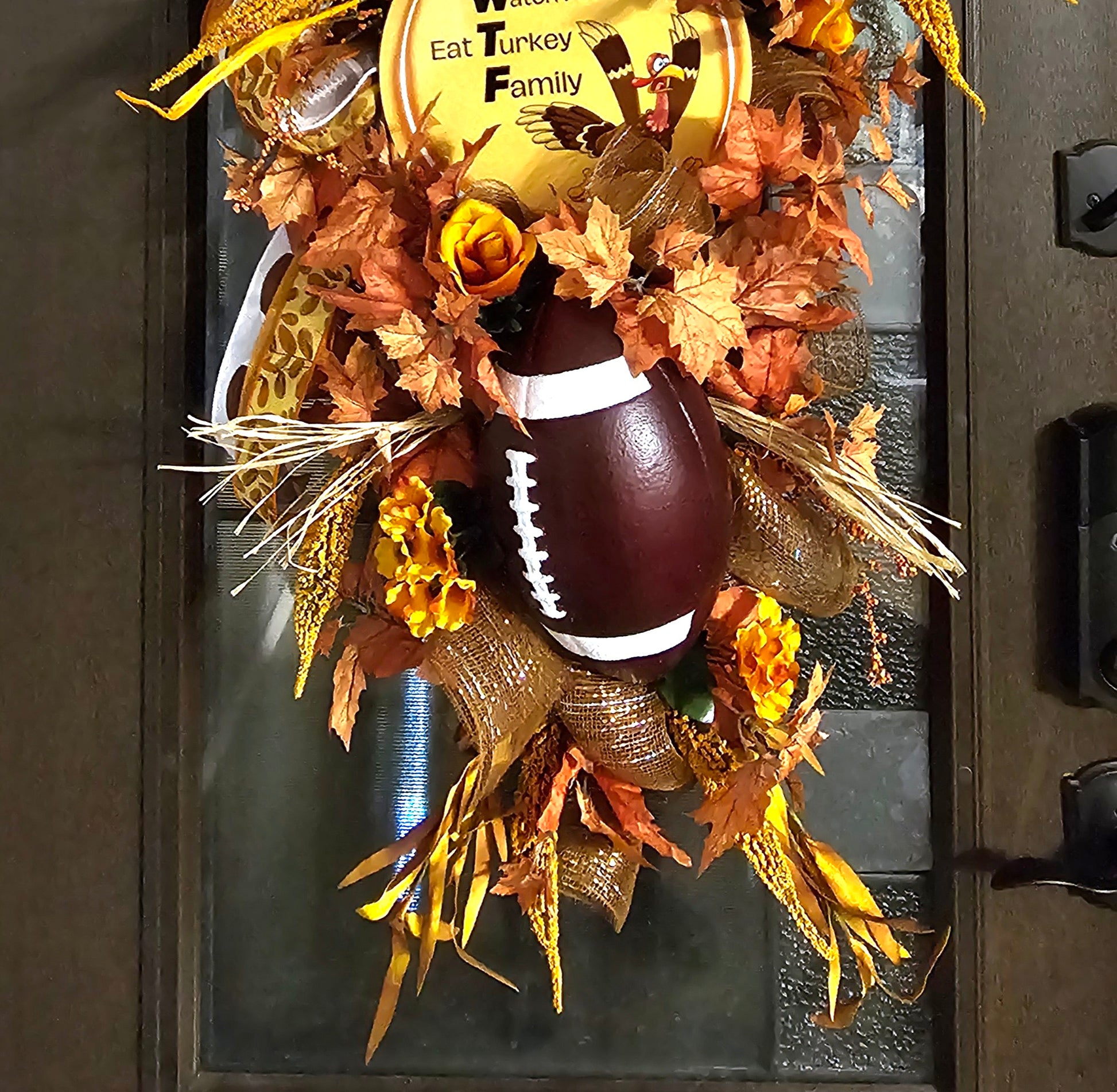 At the heart of the design sits a playful “WTF – Watch Football, Eat Turkey, Family” sign that brings humor and personality to your décor. A large football focal point anchors the bottom, while the top bursts with layered bows in metallic gold, football-themed ribbon, and rich fall patterns—creating the perfect balance of festive charm and sporty pride.