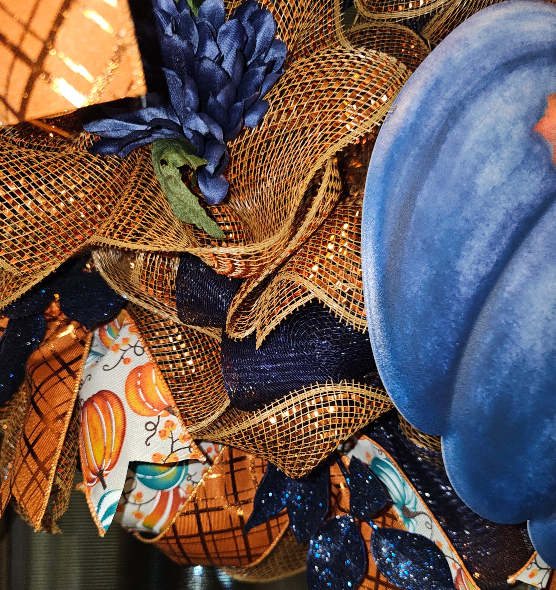 Bring a bold twist to your fall décor with our Autumn Glow Blue Pumpkin Wreath! This handcrafted design combines rich shades of burnt orange mesh, shimmering gold accents, and deep navy blue details for a look that is both vibrant and elegant. The striking blue pumpkin focal point steals the show, accented with autumn leaves and surrounded by lush navy florals and layered bows. Playful pumpkin-patterned ribbon adds charm, while metallic finishes make this wreath sparkle day or night.