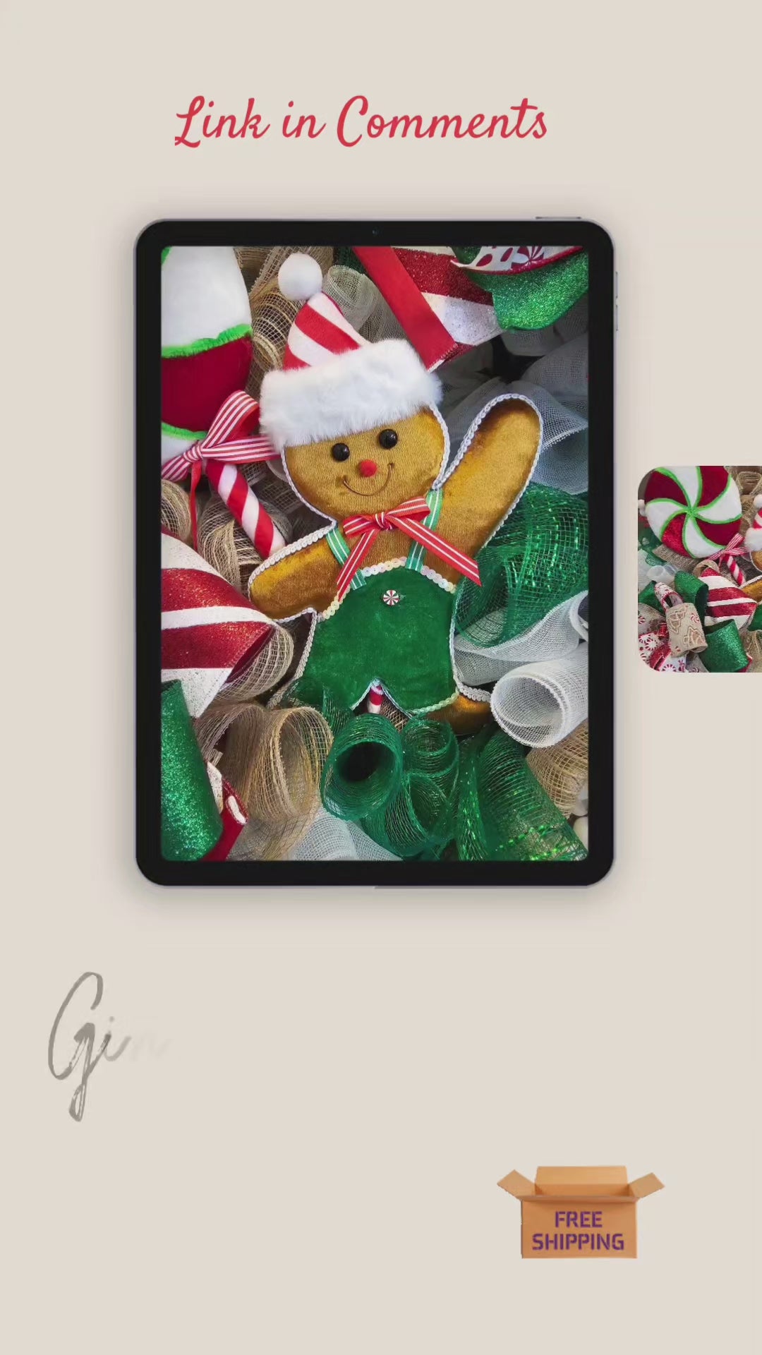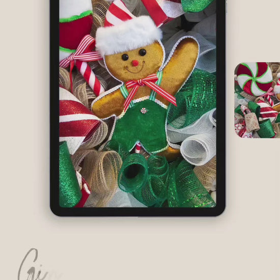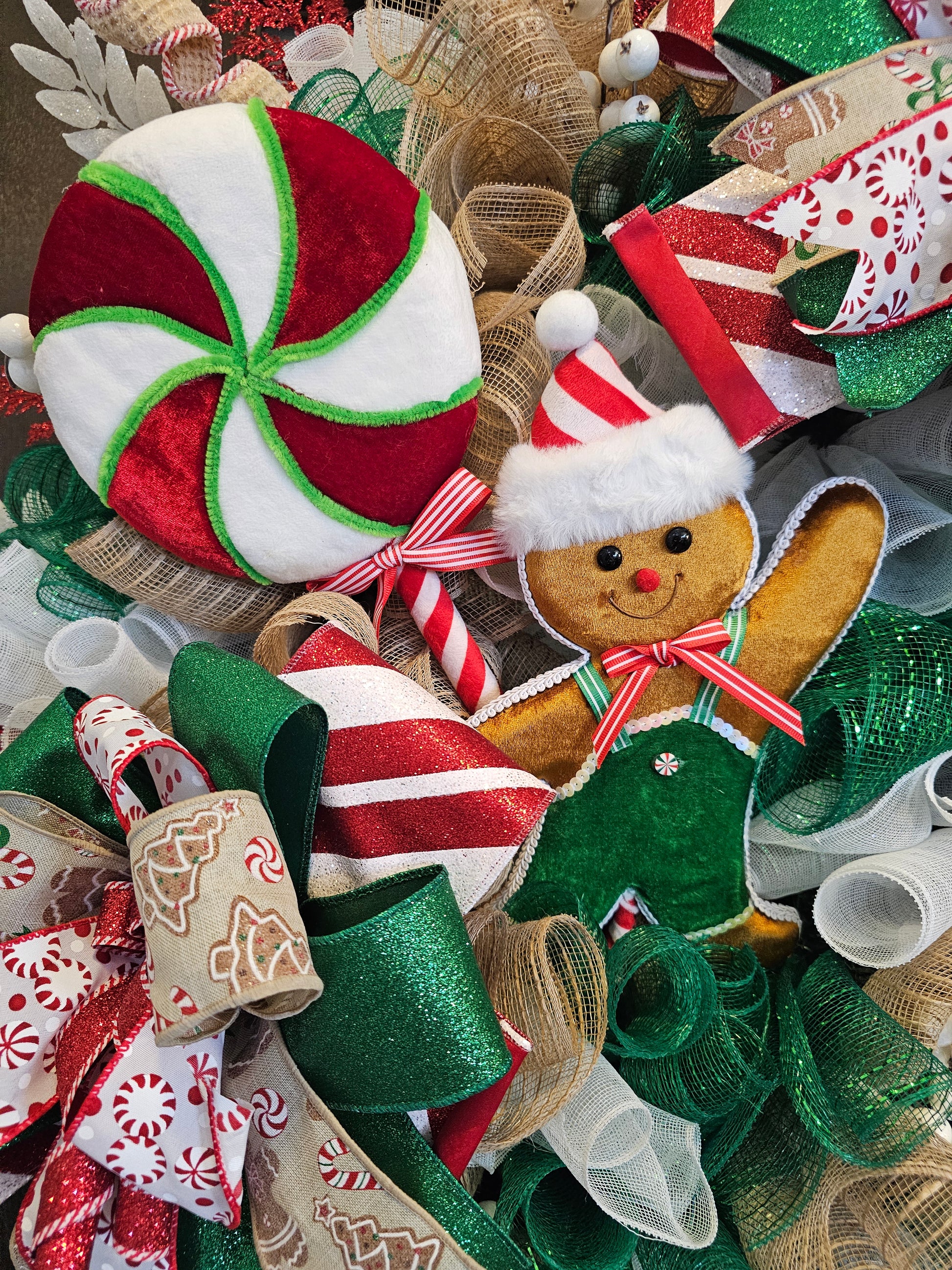 Bring holiday cheer straight to your door with this whimsical Gingerbread Delight Christmas Wreath! Bursting with festive charm, this handcrafted design features a plush gingerbread character in a green outfit, surrounded by shimmering mesh in white, burlap, and emerald green. Bold layered bows in glittering red, green, and patterned ribbons add a touch of sparkle, while candy cane stripes, frosted berries, and peppermint accents complete the sweet holiday look.