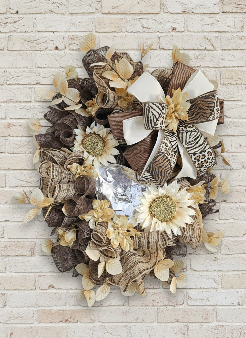 Make a bold, elegant statement with our Golden Savannah Wreath—featuring rich shades of brown, cream, and gold, accented with glittering sunflowers, animal print ribbon, and lush foliage. Perfect for adding a touch of wild sophistication to your door!