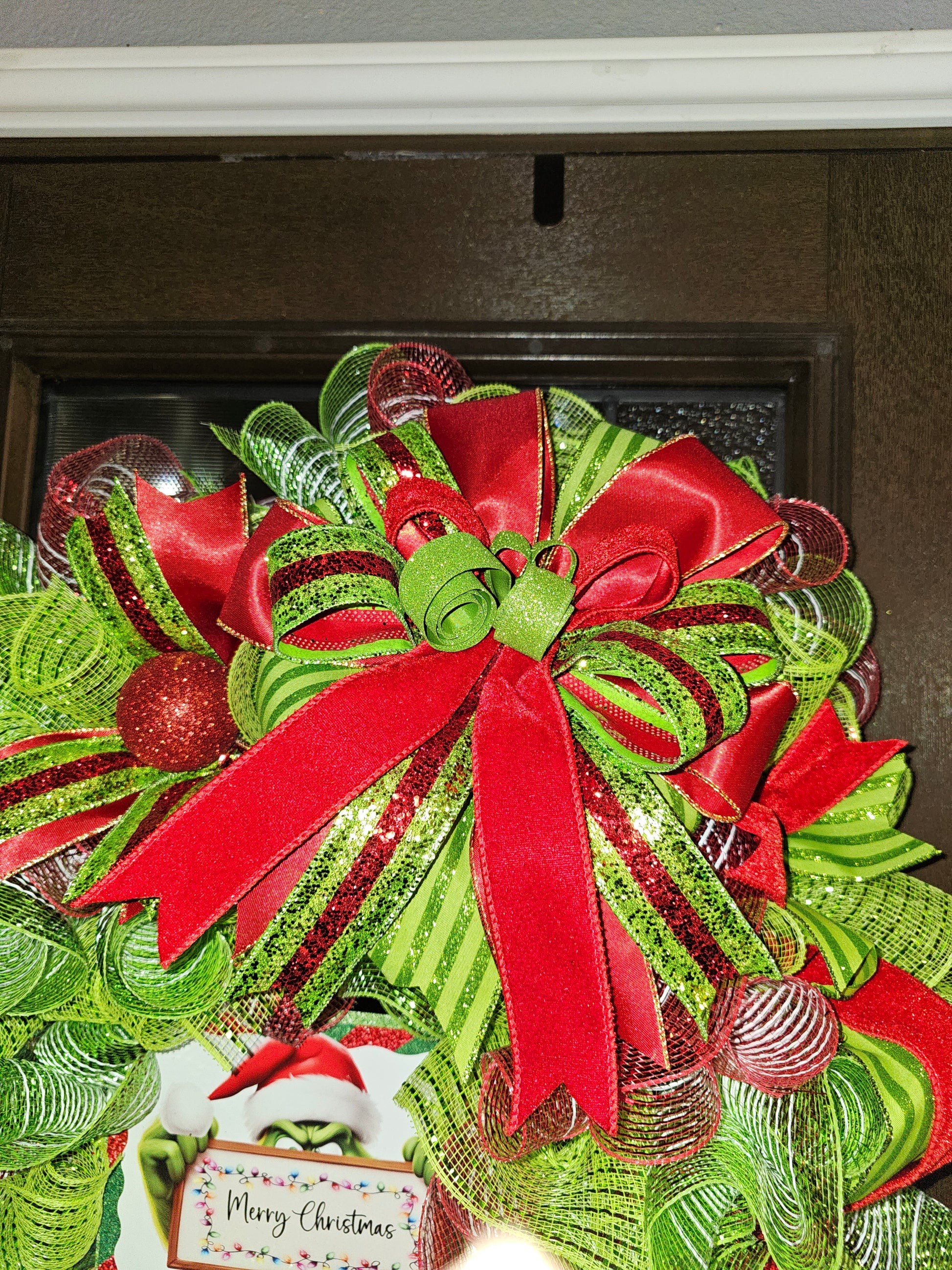 Bring a playful twist to your holiday décor with the Grinchy Christmas Cheer Wreath! This vibrant design bursts with layers of shimmering lime green mesh, sparkling red and green ribbons, and bold glittery accents that catch the light beautifully. At the heart of the wreath, a festive sign featuring the mischievous Grinch holding a “Merry Christmas” message adds a touch of holiday humor and whimsy. Perfect for making your door the talk of the neighborhood, this wreath combines classic Christmas colors with a fun character flair, spreading joy (and maybe a little mischief) all season long!