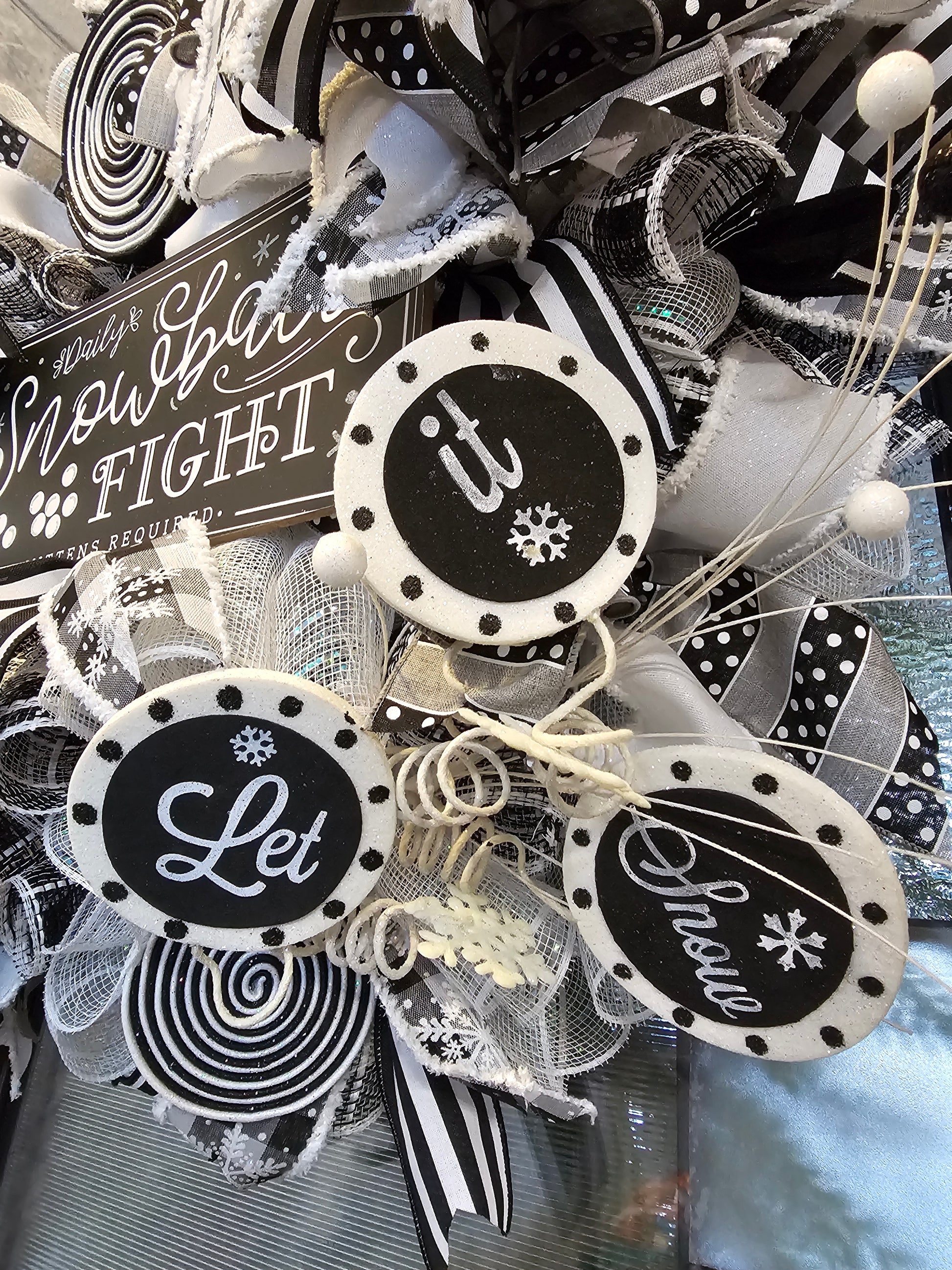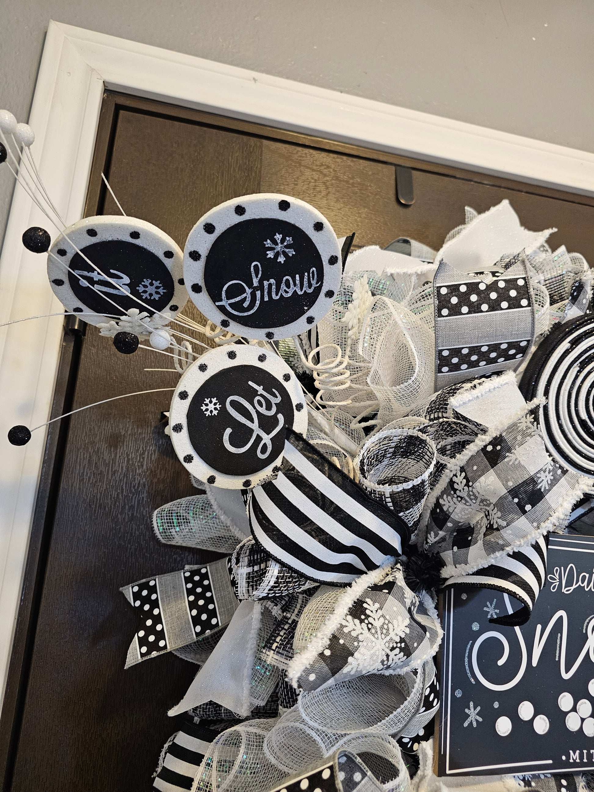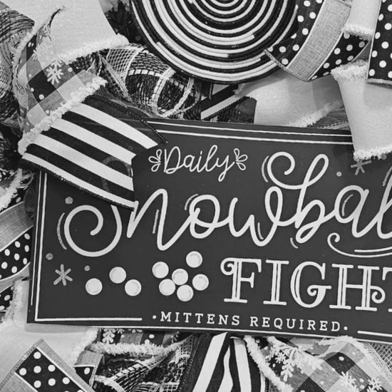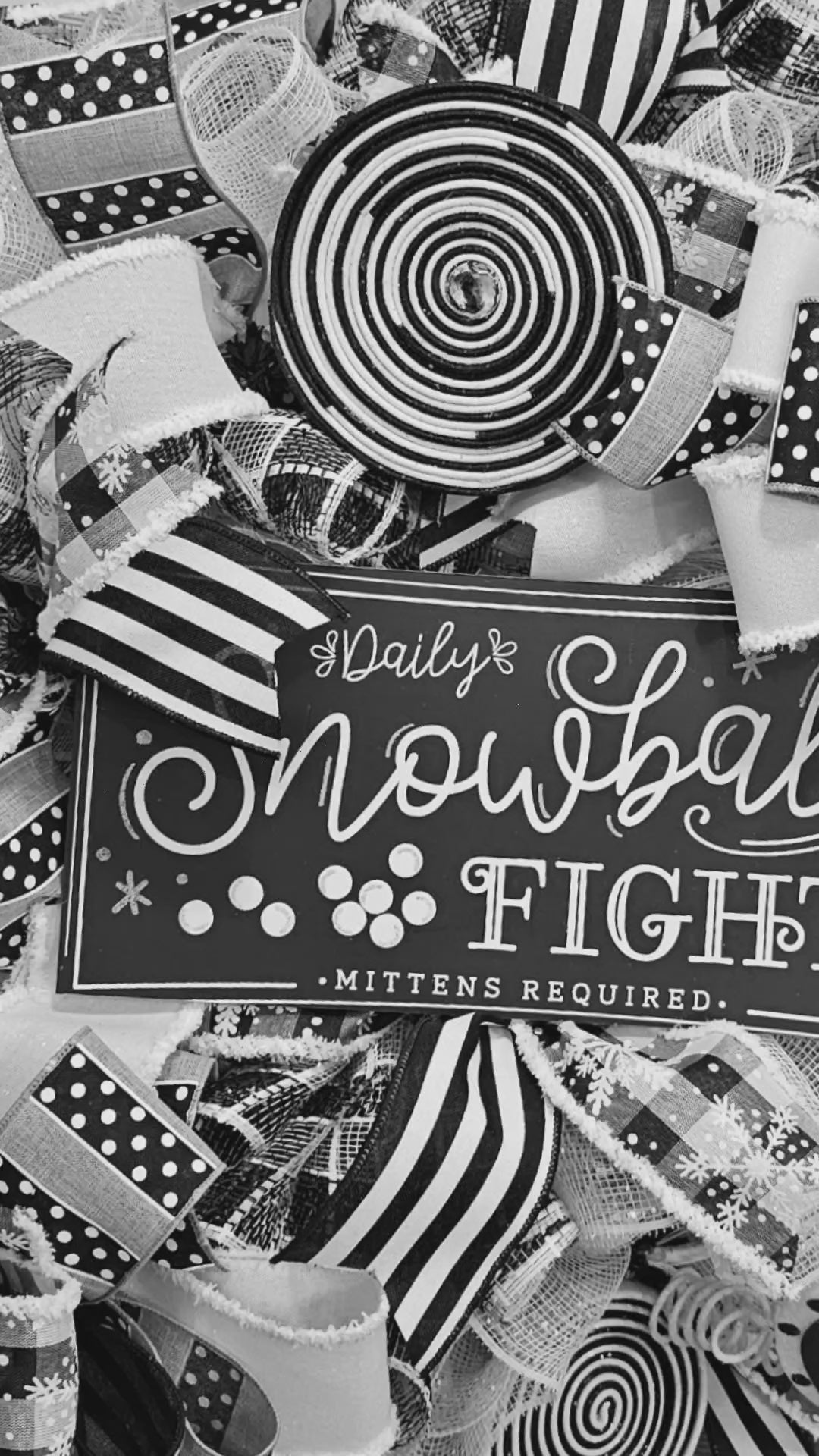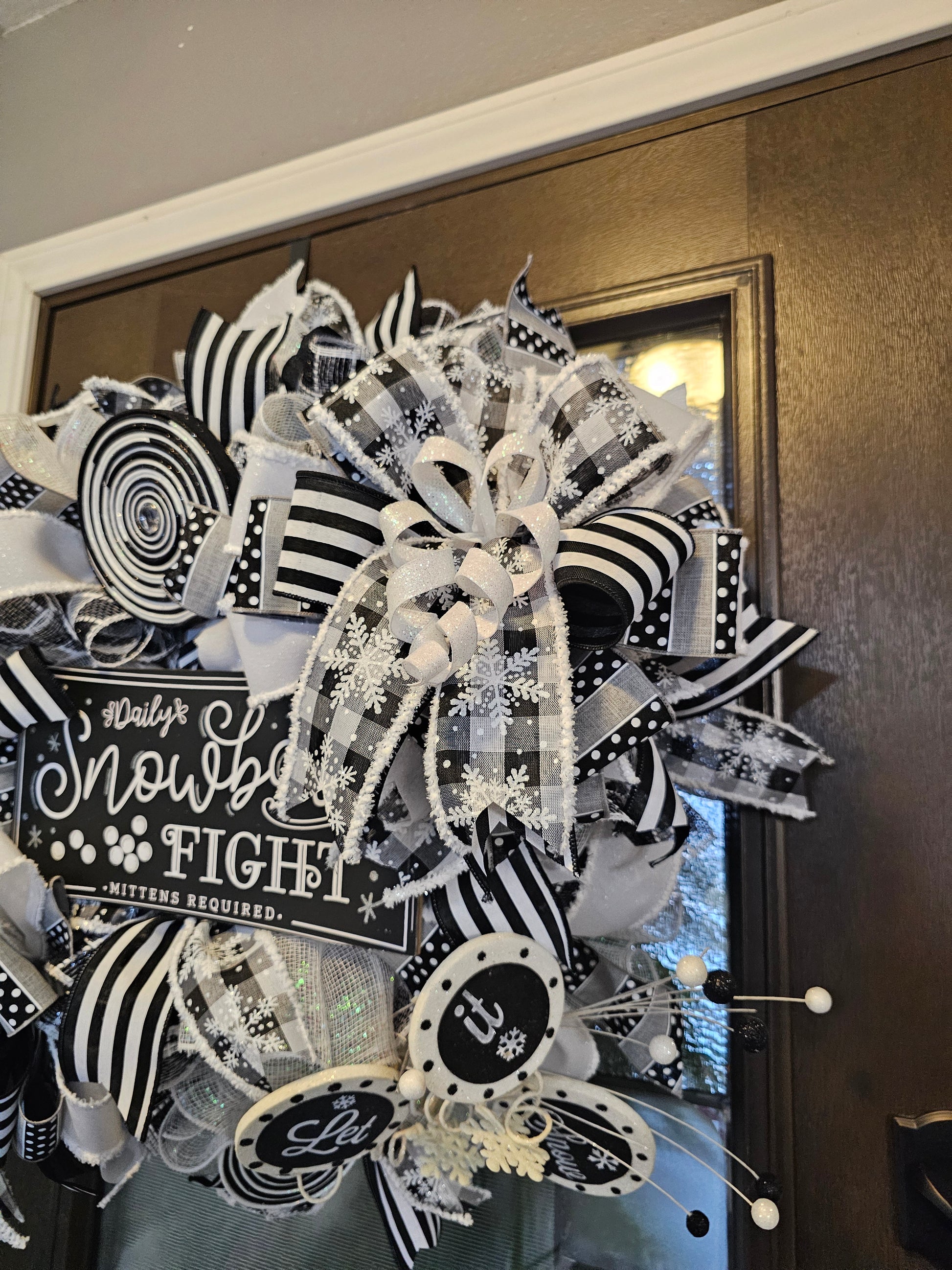 Bring a bold and contemporary twist to your holiday décor with the Monochrome Snowball Fight Wreath! This striking black-and-white design features playful ribbons in stripes, polka dots, and snowflakes that create a modern winter wonderland vibe. At the center, a whimsical sign declares “Daily Snowball Fight – Mittens Required,” making this wreath both fun and eye-catching. Perfect for front doors or interior displays, it’s a stylish way to celebrate the season with a touch of personality and charm.