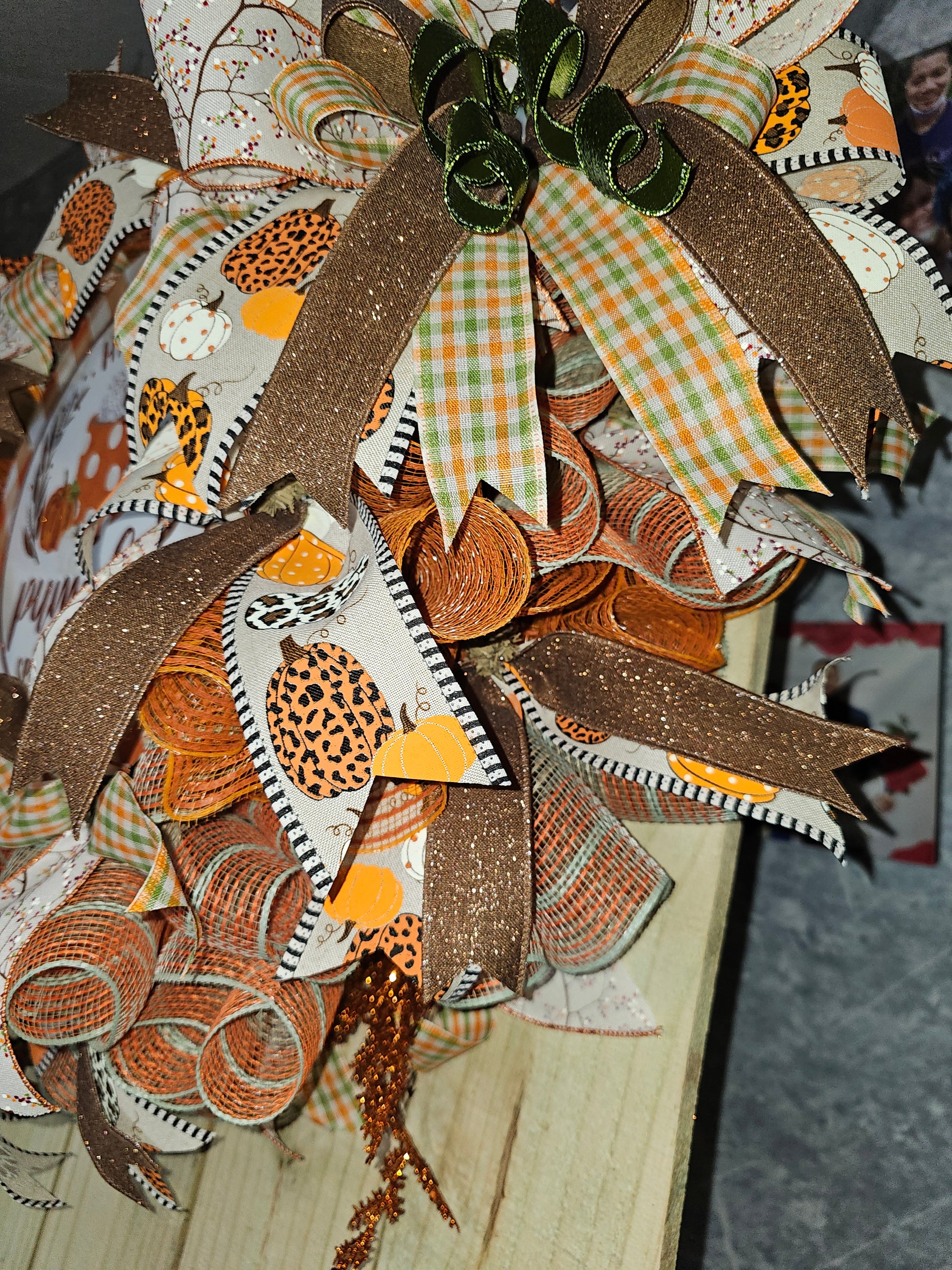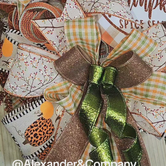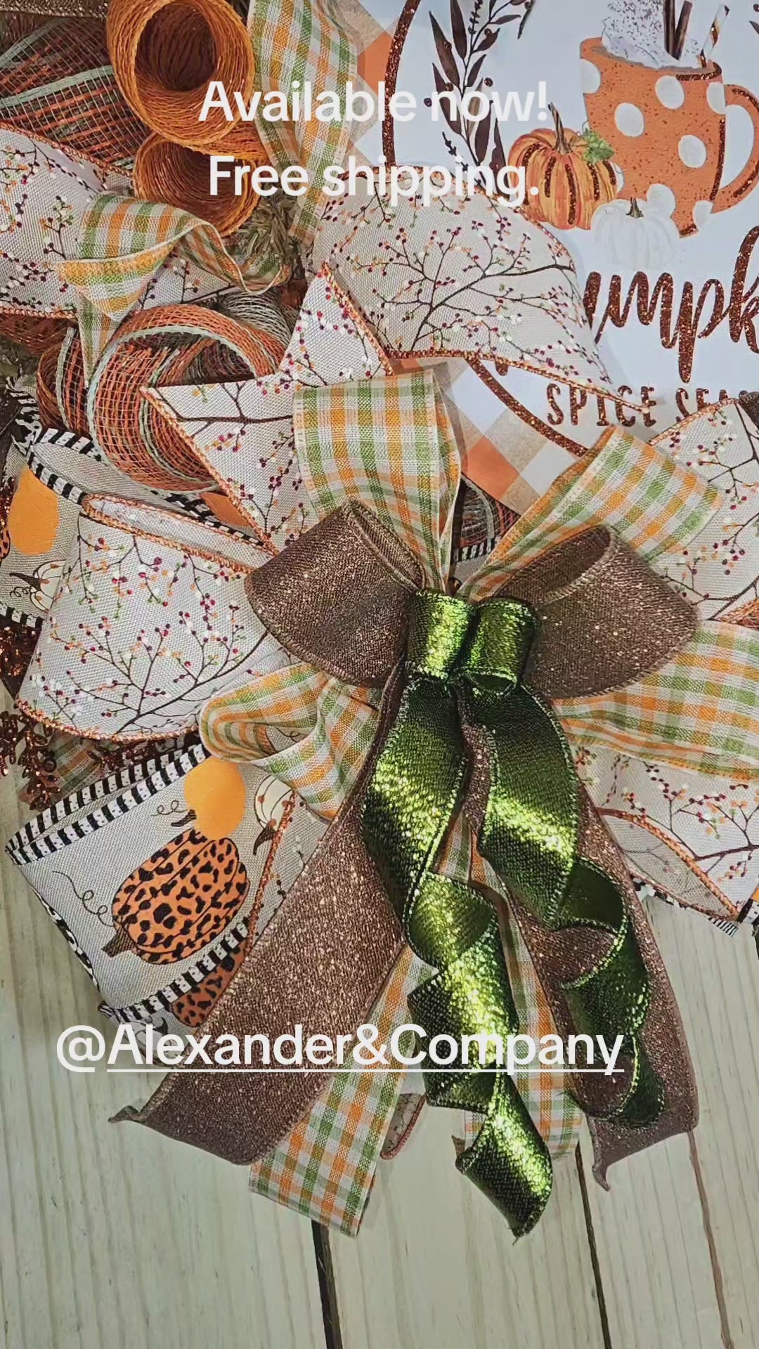 Celebrate the cozy charm of fall with this festive Pumpkin Spice Season Wreath! Bursting with warm autumn colors, this design features layers of quality deco mesh in orange, brown, and green, accented with plaid and seasonal ribbon tails. The centerpiece is a delightful round sign with a pumpkin spice latte mug and pumpkins that perfectly set the mood for crisp fall days. Glittery accents, bold bows, and playful textures make this wreath the ultimate statement piece for your front door. Perfect for welcoming guests, it captures everything we love about pumpkin spice season!