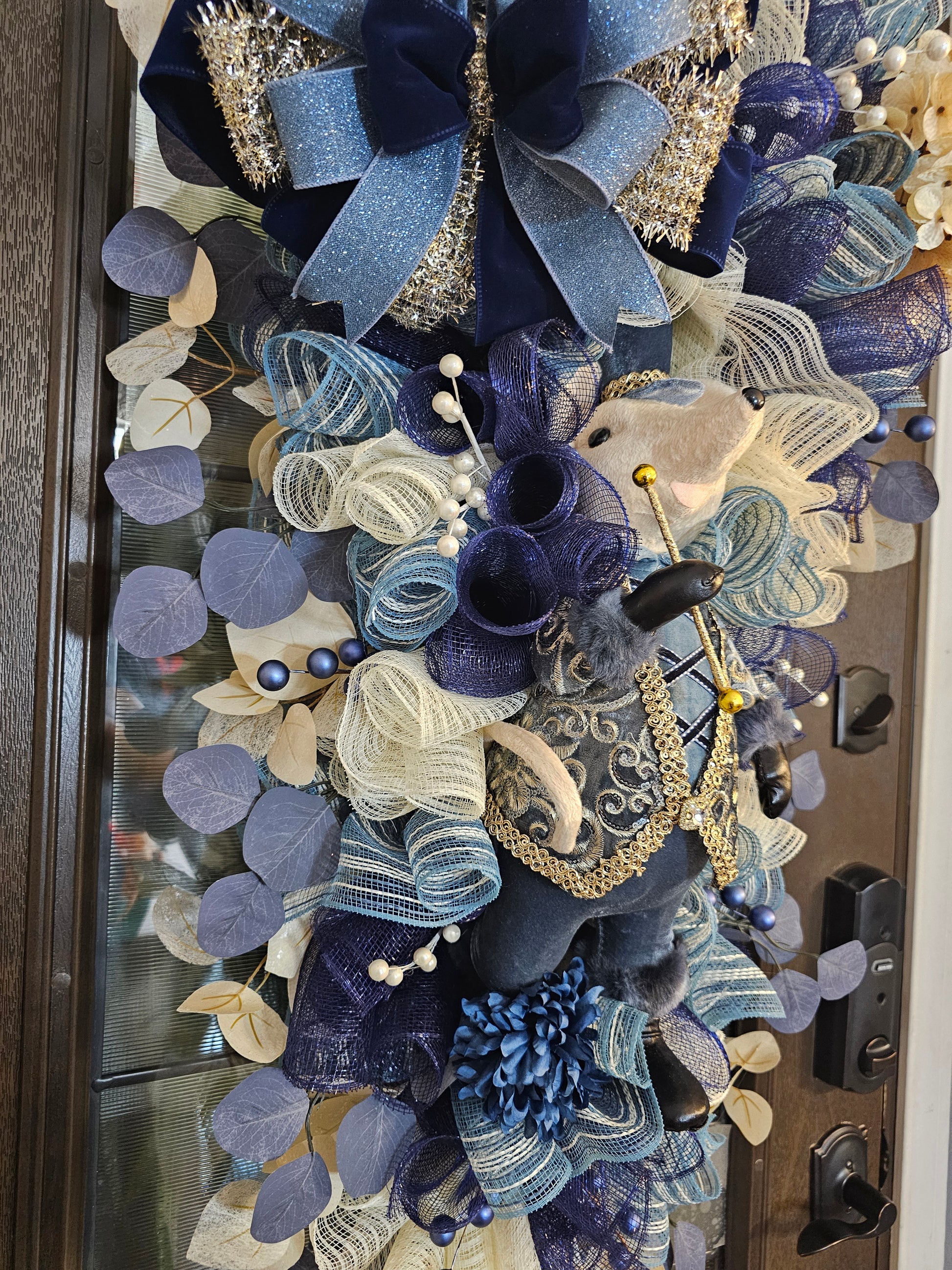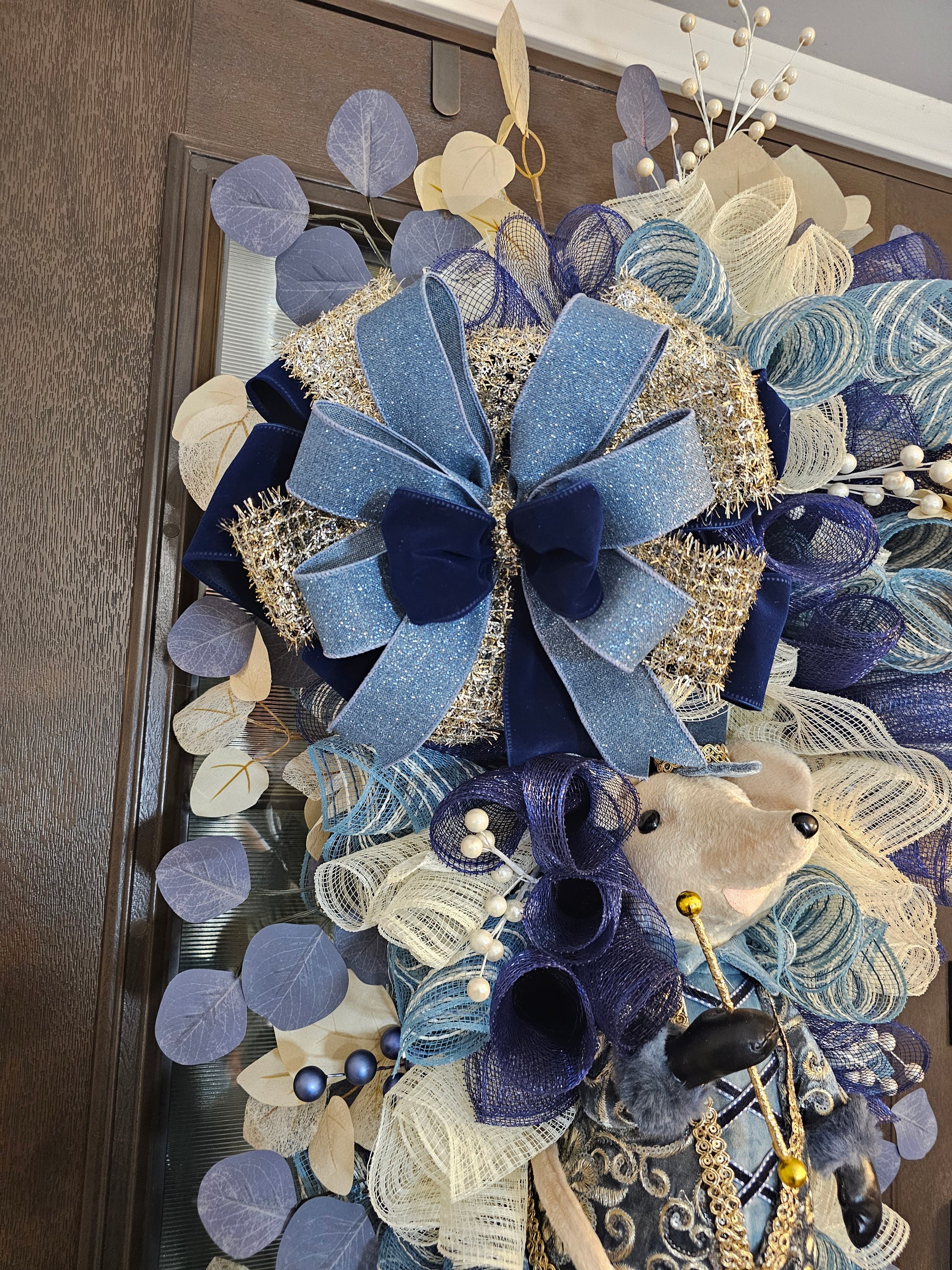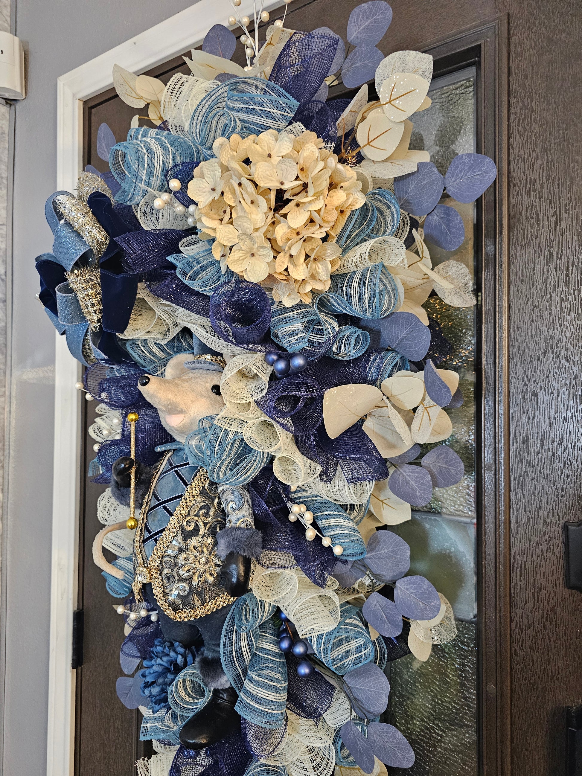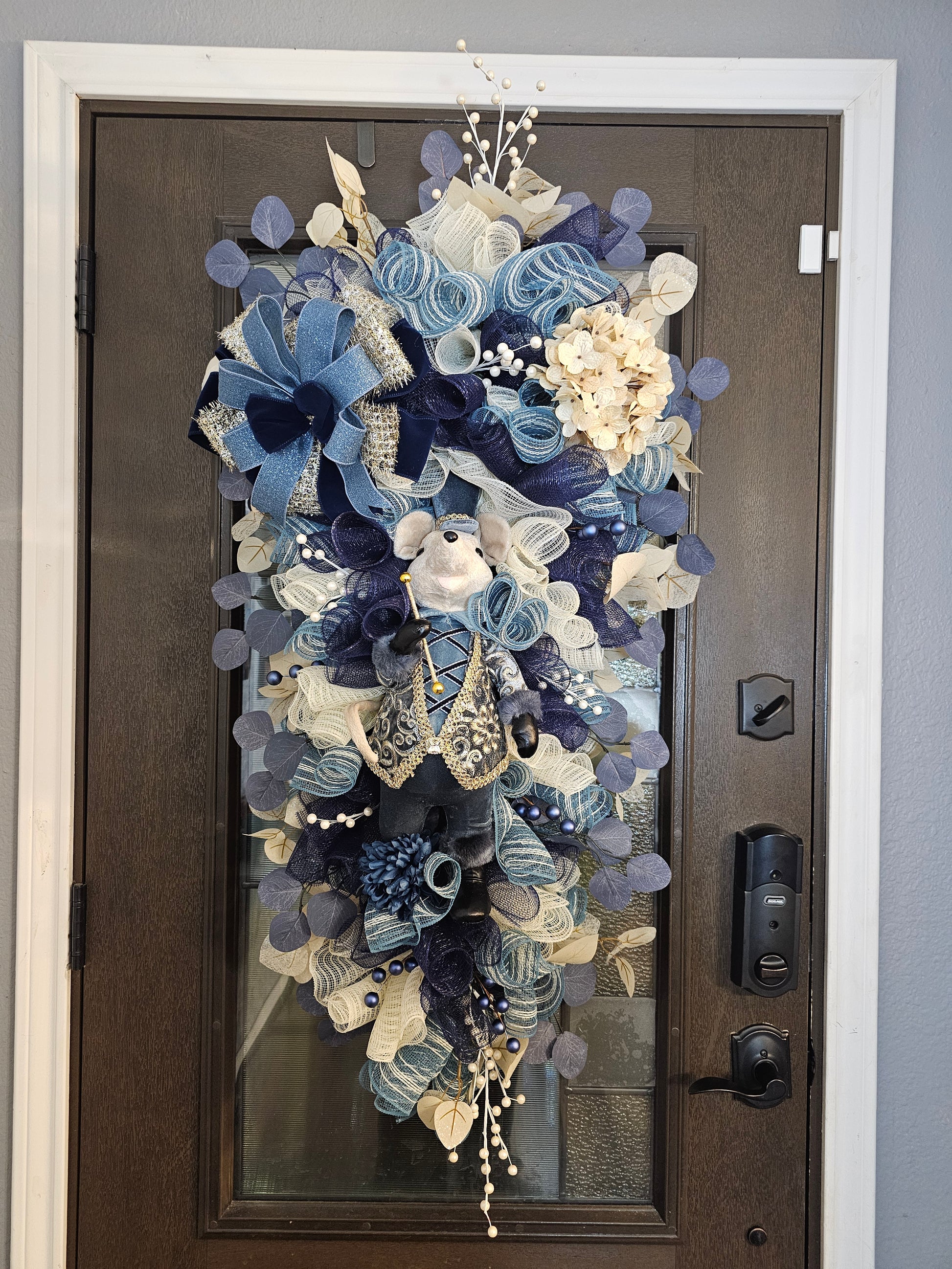 Step into winter elegance with this stunning Regal Winter Mouse Swag! Crafted on a lush base of shimmering blue and ivory deco mesh, this design blends sophistication with a touch of whimsy. The centerpiece features a finely dressed mouse in luxurious brocade and velvet attire, crowned with a jeweled hat and holding a golden scepter—truly fit for royalty!