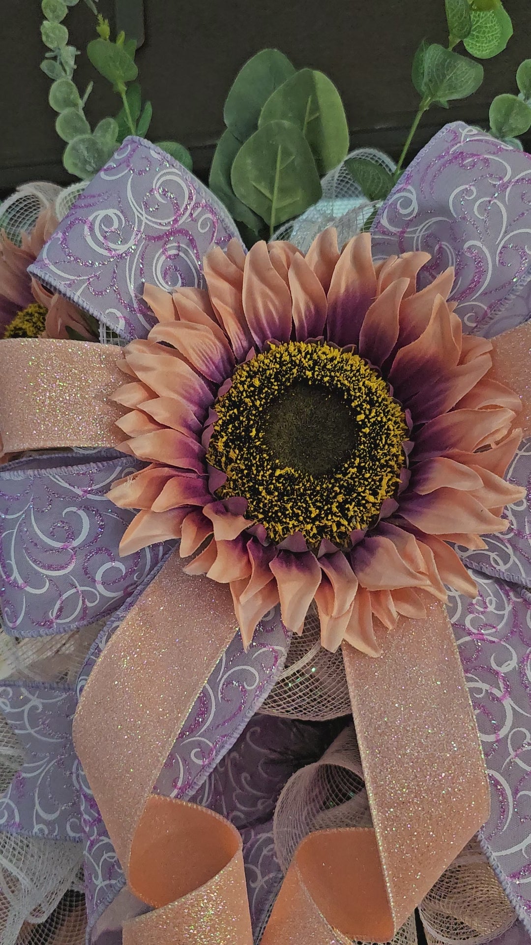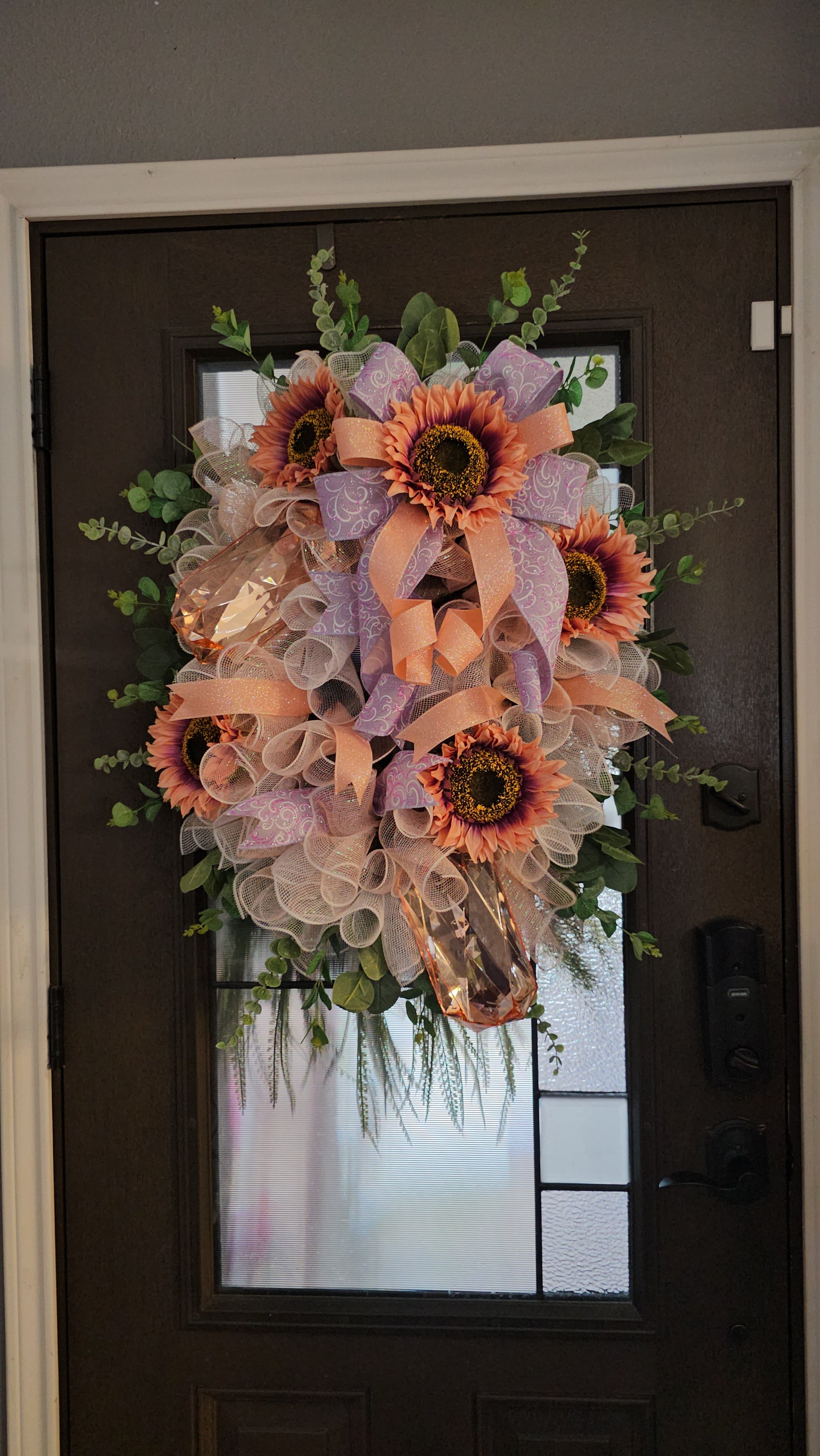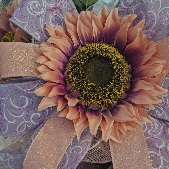 This stunning coral and purple sunflower wreath is handcrafted on a lush 24-inch evergreen base. Featuring vibrant sunflowers, whimsical mesh, sparkling ribbons, and oversized jewel accents, itβs the perfect way to welcome guests in style!